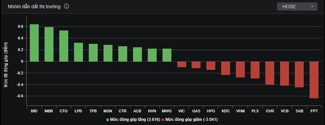 FPT quay đầu điều chỉnh, đóng cửa giảm 1,52% xuống còn 130.000 đồng/cổ phiếu, gây ảnh hưởng tiêu cực nhất đến chỉ số. Một số mã lớn khác như SAB, GVR, PLX… giảm giá.