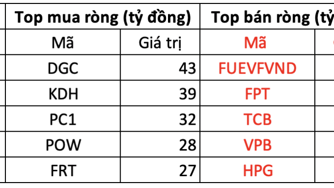 Tại chiều mua, cổ phiếu DGC là tâm điểm mua ròng của khối ngoại với giá trị 43 tỷ đồng. Theo sau, KDH và PC1 là hai mã tiếp theo được gom 39 và 32 tỷ đồng. Ngoài ra, POW và FRT cũng được mua 28 và 27 tỷ đồng.