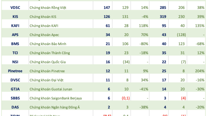 Cái tên báo lãi tiếp theo là Chứng khoán KAFI. Công ty này ghi nhận doanh thu hoạt động tăng 88% so với cùng kỳ năm trước lên 210 tỷ đồng. Đáng chú ý nhất là doanh thu môi giới cao gấp gần 7 lần cùng kỳ lên 27 tỷ. Đồng thời lãi từ tài sản FVTPL đạt gần 130 tỷ, tăng 43%. Kết quả, Chứng khoán KAFI báo lãi trước thuế hơn 61 tỷ đồng, tăng 118% so với quý 2/2023