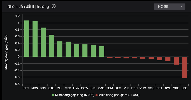 Đà hồi phục của VN-Index mạnh hơn trong phiên chiều, đặc biệt trong 30 phút cuối giờ giao dịch, khi các cổ phiếu lớn gia tăng sức ảnh hưởng. 22/30 cổ phiếu VN30 tăng giá, đứng đầu nhóm dẫn dắt thị trường là cổ phiếu công nghệ FPT. MSN, BCM, CTG, PLX, MBB… góp thêm lực kéo.