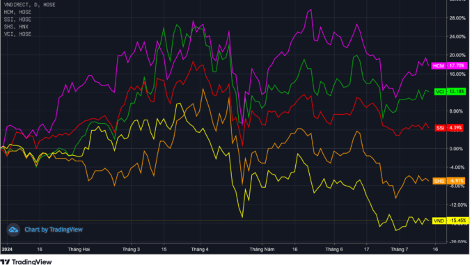 Cổ phiếu chứng khoán đã có diễn biến đầy khởi sắc trong khoảng 4 tháng đầu năm 2024, sau khi hé lộ bức tranh kết quả kinh doanh quý 1 đầy khởi sắc cộng thêm “dopping” là game tăng vốn. Tuy nhiên từ cuối tháng 4 tới nay, nhóm này lại cho thấy diễn biến có phần “hụt hơi” so với các ngành khác. Giao dịch ghi nhận ảm đạm, nhiều mã thậm chí không thể giữ được thành quả tăng giá trước đó.