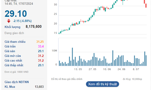 Sau giai đoạn “tăng bốc” đầu tới hơn 170% chỉ trong vòng 3 tháng (từ cuối tháng 3 đến cuối tháng 6), áp lực bán chốt lời của nhà đầu tư cũng khá dễ hiểu. Thị giá theo đó nhanh chóng sụt giảm gần 20% kể từ đỉnh ngắn hạn thiết lập mới 2 tuần trước. Vốn hóa thị trường còn lại khoảng 64.400 tỷ đồng.