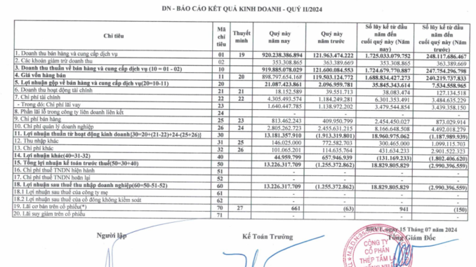 Mới đây, công ty đã có Báo cáo tài chính quý 2/2024 với những kết quả tích cực. Theo đó, Doanh thu thuần bán hàng và cung cấp dịch vụ của công ty tăng mạnh 656% so với cùng kỳ năm ngoái, lên mức 920 tỷ đồng. Trong số đó, doanh thu bán hàng hóa, thành phẩm đạt 882,7 tỷ đồng, doanh thu bán phế liệu là 18,7 tỷ đồng, phần còn lại đến từ doanh thu cung cấp dịch vụ gia công. Trong quý, công ty không ghi nhananj doanh thu dịch vụ cho thuê kho.