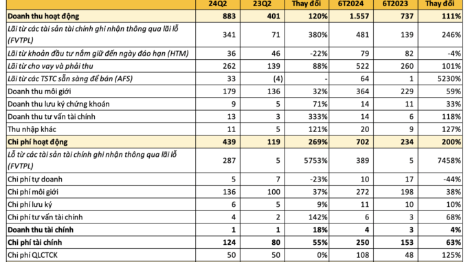 Về mảng tự doanh, lãi từ các tài sản tài chính ghi nhận thông qua lãi lỗ (FVTPL) ghi nhận 341 tỷ, gấp gần 5 lần con số của quý 2 năm ngoái; lãi từ các tài sản tài chính sẵn sàng để bán (AFS) ghi nhận 33 tỷ đồng (cùng kỳ năm trước âm hơn 4 tỷ); ngược lại, lãi từ khoản đầu tư nắm giữ đến ngày đáo hạn (HTM) giảm 22% xuống 36 tỷ đồng.