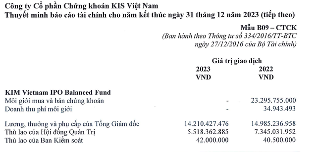 Báo cáo tài chính năm 2023 của công ty cổ phần chứng khoán KIS Vietnam cho biết trong năm 2023 vừa qua, lương, thưởng và phụ cấp của tổng giám đốc Park Won Sang là 14,2 tỷ đồng. Trong khi đó, cả HĐQT KIS Việt Nam năm 2023 chỉ nhận về thù lao 5,5 tỷ đồng.