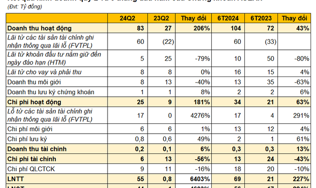 Kết quả, Chứng khoán Asean báo lãi trước thuế gần 55 tỷ đồng, tăng đến 6.400% so với cùng kỳ 2023. Lũy kế nửa đầu năm 2024, CTCK này ghi nhận lợi nhuận trước thuế hơn 69 tỷ đồng, cao gấp 3 lần cùng kỳ năm trước.