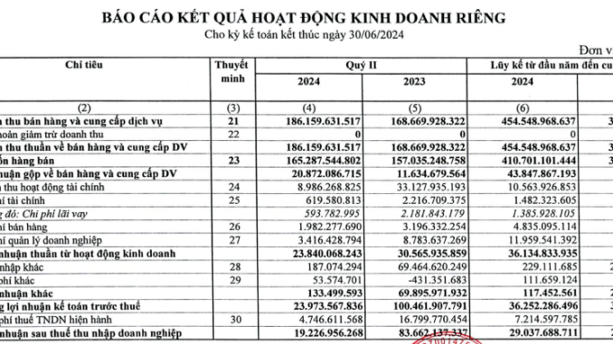 Doanh thu hoạt động tài chính kỳ này giảm mạnh 73% so với cùng kỳ xuống gần 9 tỷ đồng do khoản cổ tức, lợi nhuận được chia đều giảm. Mặc dù các loại chi phí như tài chính, bán hàng, quản lý doanh nghiệp đều được tiết giảm so với cùng kỳ, song lợi nhuận sau thuế chỉ đạt 19 tỷ đồng, giảm 77% so với cùng kỳ.
