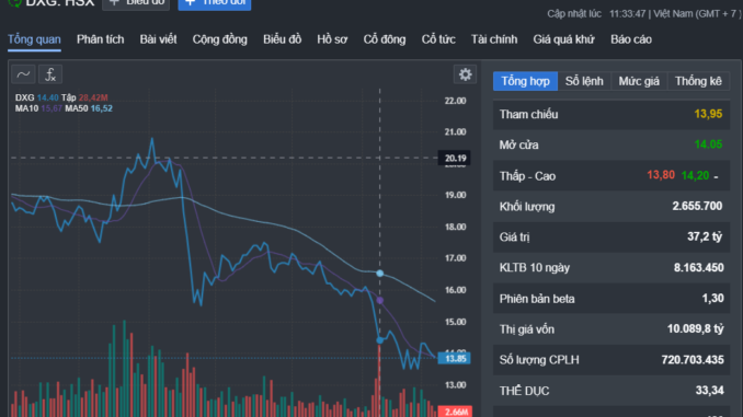 Trên thị trường chứng khoán, cổ phiếu DXG có sự sụt giảm từ mức gần 21.000 đồng vào đầu tháng 4-2024 và hiện chỉ còn chưa tới 14.000 đồng/cổ phiếu.