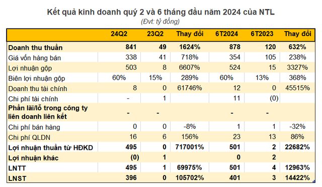 Tại thời điểm 30/6/2024, tổng tài sản của NTL ở mức 2.658 tỷ đồng, tăng 31% so với thời điểm đầu năm. Các khoản tiền mặt và tiền gửi ngân hàng tăng từ gần 780 tỷ lên 1.604 tỷ đồng, chiếm tới 60% tổng tài sản. Về phía nguồn vốn, vốn chủ sở hữu đạt 1.685 tỷ đồng, tăng 15% so với đầu năm, lợi nhuận sau thuế chưa phân phối tính đến hết quý 2/2024 đạt 1.075 tỷ đồng. Lideco không còn ghi nhận khoản nợ vay tài chính nào.