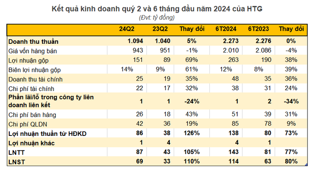 Theo BCTC quý 2/2024 mới công bố, CTCP Dệt may Hòa Thọ (mã: HTG) ghi nhận doanh thu thuần đạt 1.094 tỷ đồng tăng 5% so với cùng kỳ năm trước. Chi phí giá vốn giảm nhẹ 1% giúp biên lãi gộp cải thiện từ 9% trong quý 2/2023 tăng lên 14%. Lợi nhuận gộp nhờ vậy tăng mạnh 69% so với cùng kỳ lên 151 tỷ đồng.