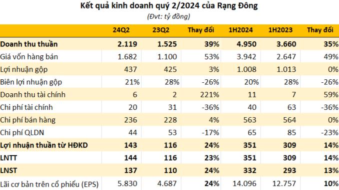 Lũy kế 6 tháng đầu năm 2024, doanh thu thuần tăng trưởng 35% so với cùng kỳ lên 4.950 tỷ, biên lãi gộp đạt 30%. Khấu trừ các chi phí, lãi trước thuế của RAL tăng 14% lên 351 tỷ đồng. EPS 6 tháng đạt 14.096 đồng – top đầu sàn chứng khoán.