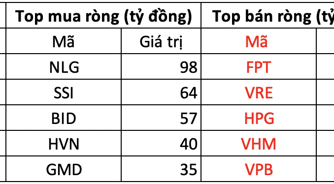Tại chiều mua, cổ phiếu NLG là tâm điểm mua ròng của khối ngoại với giá trị 98 tỷ đồng. Theo sau, SSI và BID là hai mã tiếp theo được gom 64 và 57 tỷ đồng. Ngoài ra, HVN và GMD cũng được mua 40 và 35 tỷ đồng.