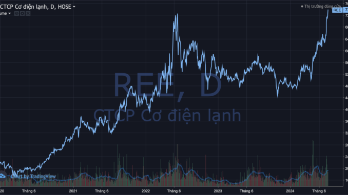 Trong khi VN-Index vẫn còn đang “loay hoay” dưới 1.300 điểm, một cổ phiếu Bluechip là REE lại âm thầm đi lên lập đỉnh mới. Từ đầu năm 2024 đến nay, cổ phiếu này đã tăng 52% lên mức 73.900 đồng/cp, cao nhất kể từ khi niêm yết. Giá trị vốn hóa của REE cũng theo đó lập kỷ lục hơn 34.700 tỷ đồng.