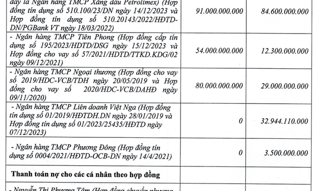 Chiều ngược lại, Hodeco thay đổi số tiền trả cho Ngân hàng Liên doanh Việt Nga từ 0 đồng lên gần 33 tỷ; trả nợ cho Ngân hàng Phương Đông 3,5 tỷ khi phương án trả nợ ban đầu là 0 đồng.