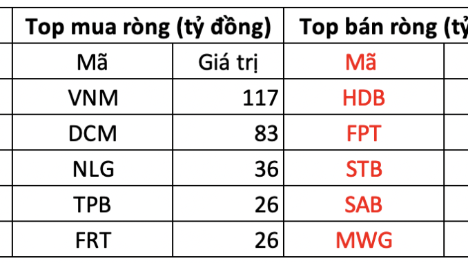 Tại chiều mua, cổ phiếu VNM là tâm điểm mua ròng của khối ngoại với giá trị 117 tỷ đồng. Theo sau, DCM và NLG là hai mã tiếp theo được gom 83 và 36 tỷ đồng. Ngoài ra, TPB và FRT cũng được mua 26 tỷ đồng.