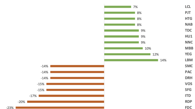 Trên HOSE, cổ phiếu LBM của Công ty Cổ phần Khoáng sản và Vật liệu xây dựng Lâm Đồng dẫn đầu danh sách cổ phiếu tăng mạnh nhất. Dù gặp áp lực điều chỉnh trong phiên 17/7 khiến LBM “nằm sàn”, song tính chung cả tuần thị giá cổ phiếu vẫn bứt phá 14% lên 32.600 đồng/cp. Giao dịch trên LBM cũng khá sôi động với vài trăm nghìn đơn vị khớp lệnh.