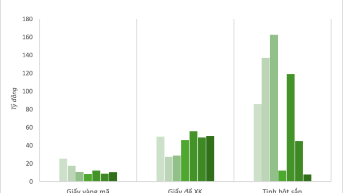 Tương tự, doanh thu sản phẩm vàng mã cũng giảm hơn 4% so với cùng kỳ niên độ trước xuống hơn 10 tỷ. Trong khi đó, giấy đế xuất khẩu đem về hơn 50 tỷ trong kỳ này, tăng 74% so với cùng kỳ niên độ trước và tăng gần 4% so với quý liền trước.