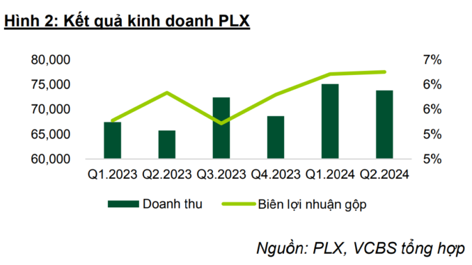 “Chúng tôi kỳ vọng sản lượng xăng dầu kinh doanh của PLX trong giai đoạn 2024 – 2025 sẽ tăng lần lượt 3,3% và 1,8% so với cùng kỳ. Biên lợi nhuận gộp có thể cải thiện từ năm 2025 khi chi phí kinh doanh định mức trong công thức giá bán xăng dầu cơ sở tăng lên từ tháng 7/2024. Chúng tôi kỳ vọng biên lợi nhuận gộp của PLX giai đoạn 2024 – 2025 lần lượt đạt 6,1% (tăng 0,5 điểm phần trăm so với cùng kỳ) và 6,5% (tăng 0,4 điểm phần trăm so với cùng kỳ).