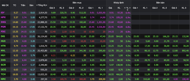 Giao dịch đáng chú ý ghi nhận tại nhóm bất động sản, với IDI, HPX, DXG, PDR, FDC cùng tăng trần. Các mã như DXG, PDR trắng bên bán, cuối phiên vẫn còn hàng triệu cổ phiếu chờ mua giá trần.