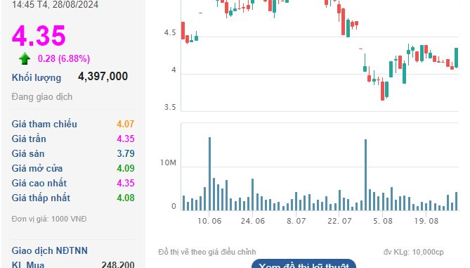 Cụ thể, kết phiên 28/8, cổ phiếu HNG của Công ty CP Nông nghiệp Quốc tế Hoàng Anh Gia Lai tăng trần 6,88% lên 4.350 đồng/cổ phiếu, khối lượng cổ phiếu giao dịch khớp lệnh đạt gần 4,4 triệu đơn vị.