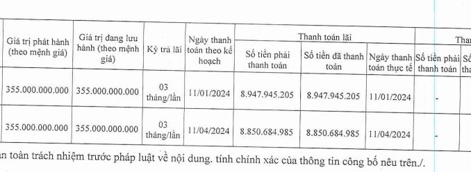 Liên quan đến lô trái phiếu DHACH2124001, trong nửa đầu năm 2024, Đầu tư DHA đã thanh toán 2 kỳ trả lãi với tổng số tiền 17,8 tỷ đồng.