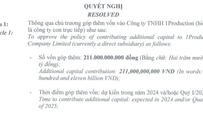Mục đích là để Công ty 1Production bổ sung vốn cho hoạt động kinh doanh. Thời gian góp vốn dự kiến trong năm 2024 và/hoặc quý I/2025. Sau khi góp thêm vốn, giá trị phần vốn góp của Yeah1 tại 1Production là 350 tỉ đồng.