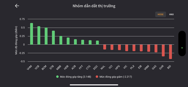 Đà tăng của VN-Index phụ thuộc chủ yếu vào một số mã lớn, trong khi nhóm midcap (vốn hoá trung bình) vẫn gây áp lực. Sắc đỏ vẫn chiếm ưu thế trên HoSE, hơn 250 cổ phiếu giảm giá. Thanh khoản giảm mạnh , tâm lý thận trọng của phần đông các nhà đầu tư khiến cả bên mua và bên bán đều dè chừng.