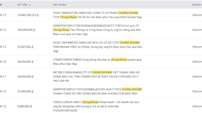 Theo thông tin từ dữ liệu do Mặt Trận Tổ Quốc (MTTQ) đã cung cấp, căn cứ trên nội dung chuyển tiền của các giao dịch, nhiều công ty chứng khoán đã xuất hiện trong danh sách sao kê, trong đó có CTCP chứng khoán SSI với số tiền 10.460.780.225 đồng (hơn 10,4 tỷ đồng). Giao dịch được thực hiện vào ngày 13/9, thông qua số tài khoản Vietcombank với nội dung: “CTCP chứng khoán SSI tài trợ cho khắc phục hậu quả thiên tai bão Yagi”.