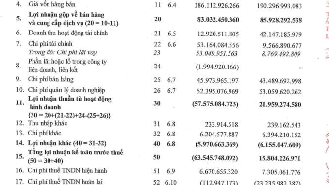 Doanh thu tài chính giảm 69,4% về còn 12,9 tỷ đồng. Ngược lại, chi phí tài chính tăng đột biến gấp 5,5 lần, lên 53,1 tỷ đồng do tăng chi phí lãi vay. Chi phí bán hàng và chi phí quản lý doanh nghiệp biến động nhẹ, lần lượt ghi nhận ở mức 46 tỷ đồng và 52,4 tỷ đồng.