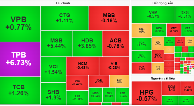 Đặc biệt, phiên này khối ngoại mua ròng cổ phiếu với tổng giá trị ròng đạt 969 tỉ đồng, tập trung mua TPB, DXG, HDB…