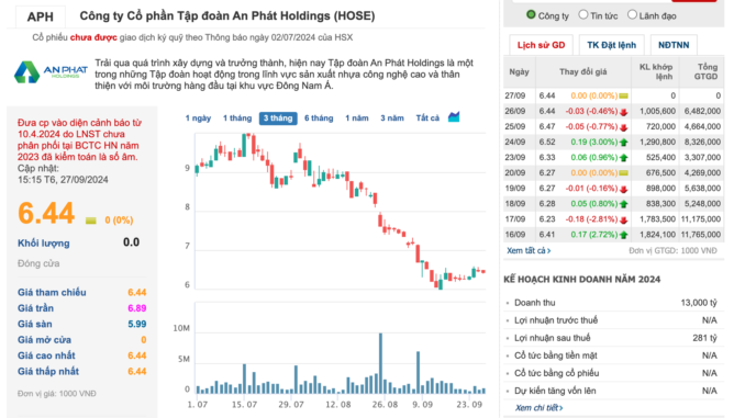 Trên sàn chứng khoán, cổ phiếu APH đã giảm hơn 40% kể từ đầu tháng 6 đến nay, chỉ còn 6.440 đồng/cổ phiếu, mức đáy lịch sử của mã chứng khoán này, tương ứng vốn hóa còn chưa đến 1.600 tỉ đồng, thấp hơn nhiều so với vốn điều lệ là hơn 2.400 tỉ đồng. Hiện cổ phiếu này vẫn đang trong diện cảnh báo của HoSE.