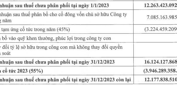 Trước đó, công ty đã trả hơn 7.100 tỷ đồng trong giai đoạn tháng 7/2023 và tháng 7/2024 thanh toán 2 đợt cổ tức năm 2023 bằng tiền, tổng tỷ lệ 100%.