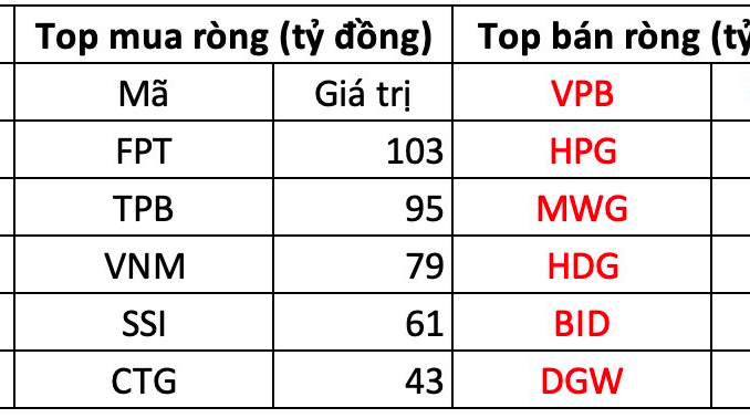 Tại chiều mua, cổ phiếu FPT được khối ngoại mua mạnh nhất trên HOSE với giá trị hơn 103 tỷ đồng. Theo sau, TPB và VNM là hai mã tiếp theo được gom 95 và 79 tỷ đồng. Ngoài ra, SSI và CTG cũng được mua lần lượt 61 và 43 tỷ đồng.