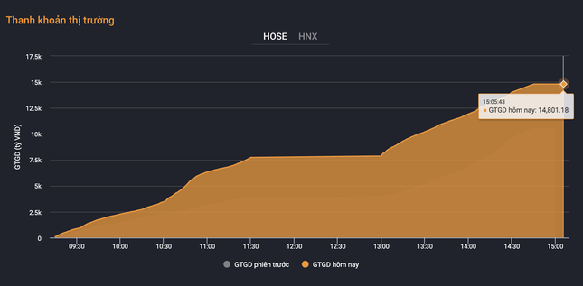 Thanh khoản tăng mạnh, giá trị khớp lệnh HoSE lên hơn 14.800 tỷ đồng.