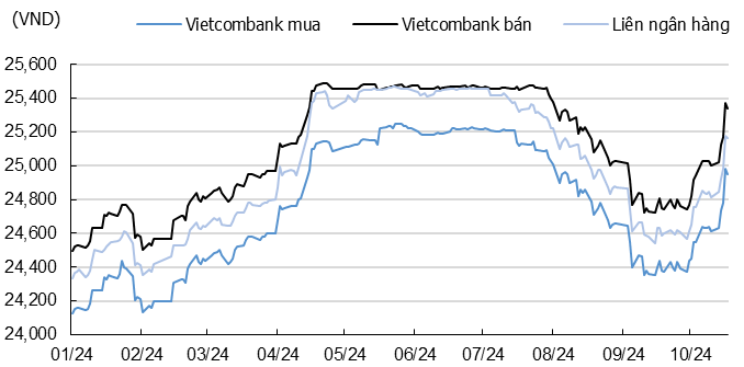 Thêm vào đó, dòng tiền bằng USD vào Việt Nam có xu hướng tăng trong các tháng cuối năm. Cụ thể, dòng vốn FDI vẫn đang chảy vào Việt Nam với mức tương đối ổn định trong 9 tháng đầu năm, với vốn đầu tư trực tiếp nước ngoài thực hiện ước đạt 17.3 tỷ USD, tăng 8.9% so với cùng kỳ năm trước. Vốn đầu tư nước ngoài đăng ký cũng tăng 11.6%, tương đương 24.7 tỷ USD. Bên cạnh đó, Tết năm 2025 sẽ đến sớm, vào cuối tháng 1/2025, nên lượng kiều hối có thể gia tăng trước Tết khoảng 1-2 tháng, giai đoạn cuối năm 2024. Các dòng vốn này tạo ra nguồn cung USD, giúp hạ nhiệt đà tăng của tỷ giá trong các tháng cuối năm.