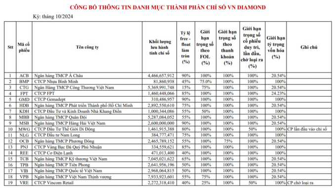 Sở GDCK TP.HCM vừa công bố thành phần chỉ số VNDiamond kỳ tháng 10/2024. Theo đó, cổ phiếu MWG của Công ty cổ phần Đầu tư Thế giới Di động đã chính thức trở lại rổ chỉ số. Bên cạnh đó, mã VRE của Công ty Cổ phần Vincom Retail nằm trong danh sách chờ loại ra. Như vậy, số lượng cổ phiếu trong rổ VNDiamond hiện là 19 mã.