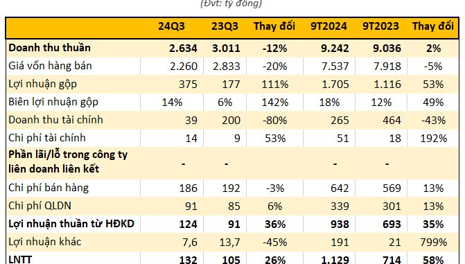 CTCP Phân bón Dầu khí Cà Mau (Đạm Cà Mau, mã chứng khoán: DCM) vừa công bố BCTC quý 3/2024 với doanh thu thuần đạt 2.634 tỷ đồng, giảm 12% so với cùng kỳ năm 2023. Giá vốn hàng bán giảm mạnh 20% giúp lợi nhuận gộp tăng cao, giá trị ghi nhận 375 tỷ đồng, tương ứng tăng 111% so với cùng kỳ.