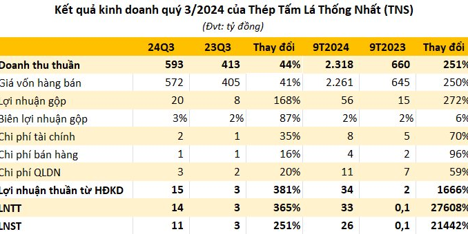 CTCP Thép tấm lá Thống Nhất (mã: TNS) đã công bố báo cáo tài chính quý 3/2024 với doanh thu thuần tăng 44% so với cùng kỳ năm trước lên 593 tỷ đồng. Giá vốn hàng bán tăng chậm hơn giúp lợi nhuận gộp đạt 20 tỷ, gấp 2,7 lần cùng kỳ năm 2023. Biên lãi gộp cải thiện lên 3%.