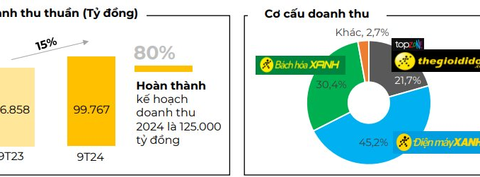 Công ty cổ phần Đầu tư Thế giới Di động (mã MWG) đã công bố kết quả kinh doanh 9 tháng đầu năm 2024. Tổng doanh thu MWG đạt 99.767 tỷ, tăng trưởng 15% so với cùng kỳ năm 2023 và hoàn thành 80% kế hoạch năm (125.000 tỷ).