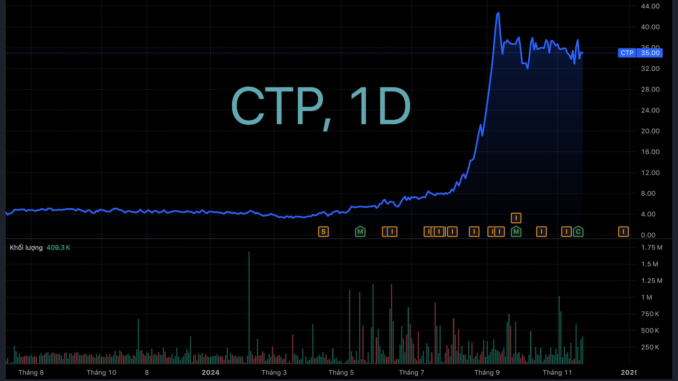 Trên sàn chứng khoán, cổ phiếu CTP trở thành hiện tượng lạ khi tăng bốc đầu trong thời gian ngắn. Từ vùng giá 4.000-5.000 đồng/cp, cổ phiếu CTP bắt đầu bật tăng mạnh từ đầu tháng 5/2024 lên vùng đỉnh 43.000 đồng/cp, tức gấp hơn 10 lần sau 4 tháng. Hiện, thị giá điều chỉnh nhẹ về 35.000 đồng/cp, thấp hơn 18% kể từ đỉnh hồi giữa tháng 9 vừa qua.