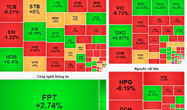 Với diễn biến giằng co của thị trường, trạng thái phân hóa khá rõ nét và biến động của các nhóm cổ phiếu tương đối hẹp. Nổi bật trong phiên là nhóm cổ phiếu công nghệ tăng giá, giúp thị trường hạn chế đà giảm điểm.