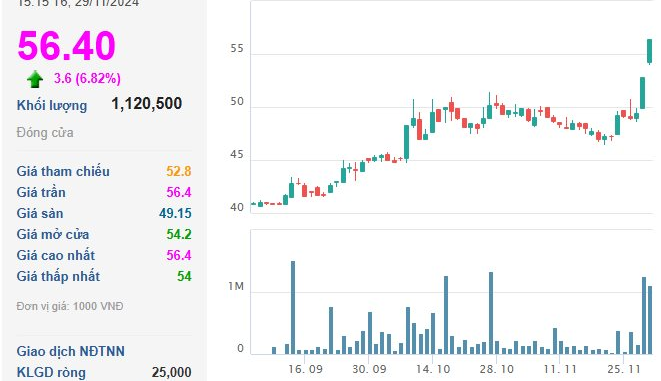 Cụ thể, kết phiên 29/11, giá cổ phiếu DBD ở mức 56.400 đồng/cổ phiếu, tăng trần 6,82% so với phiên trước, khối lượng cổ phiếu giao dịch khớp lệnh đạt hơn 1,1 triệu đơn vị.