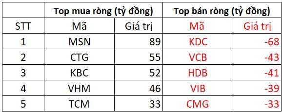 Tại chiều mua, cổ phiếu MSN được khối ngoại mua mạnh nhất trên HOSE với giá trị 89 tỷ đồng. Theo sau, CTG và KBC là hai mã tiếp theo được gom 55 tỷ và 52 tỷ đồng. Ngoài ra, VHM và TCM cũng được mua lần lượt 46 và 33 tỷ đồng.