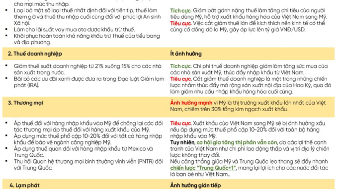 Ngược lại, việc cắt giảm thuế cá nhân của ông Trump nhằm thúc đẩy chi tiêu tiêu dùng của Mỹ có thể tác động tích cực đến xuất khẩu của Việt Nam. Phần lớn hàng xuất khẩu của Việt Nam sang Hoa Kỳ bao gồm hàng hóa thành phẩm, bao gồm đồ điện tử, hải sản, may mặc và đồ nội thất.