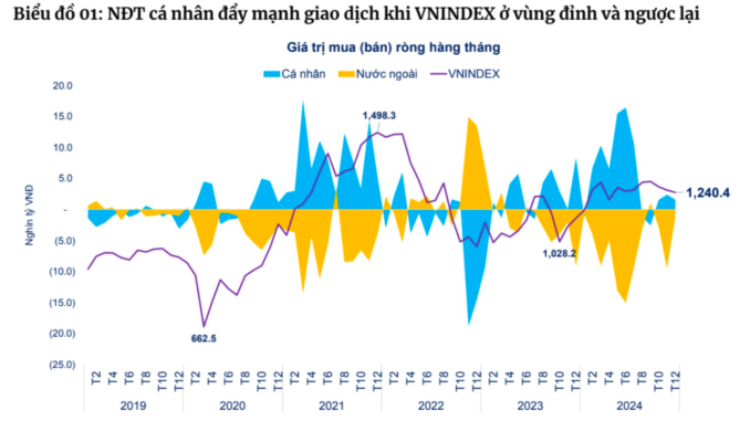 Theo ông Thuân, thị trường chứng khoán Việt Nam là “cuộc chiến” giữa 9 triệu tài khoản cá nhân, với các nhà đầu tư nước ngoài. NĐT cá nhân đẩy mạnh giao dịch khi VN-Index ở vùng đỉnh và ngược lại, trong khi NĐT nước ngoài lại bán ròng mạnh. Thực tế, NĐT trong nước rất “lười” cắt lỗ, nhìn vào hành vi giao dịch thì có thể đánh giá hầu hết nhà đầu tư cá nhân đang lỗ (giai đoạn sóng từ 2021 và đầu 2024).