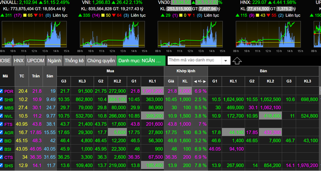 Sau phiên sáng khá ảm đạm, thị trường có phiên chiều “bùng nổ” cả về điểm số lẫn thanh khoản. Dòng tiền lan toả tại hầu hết các nhóm ngành, kéo hàng loạt cổ phiếu đảo chiều từ vùng giá đỏ trong phiên sáng sang sắc xanh. 3 nhóm cổ phiếu trụ là ngân hàng , bất động sản, chứng khoán đều nổi sóng, trong đó, hàng loạt cổ phiếu chứng khoán tăng kịch trần như SSI, VIX, HCM, FTS, VCI, ORS, CTS, BSI…