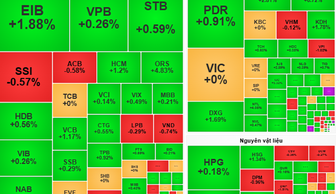 Với nỗ lực tăng điểm của thị trường, tuy nhiều nhóm cổ phiếu tiếp tục có sắc xanh nhưng trạng thái phân hóa khá rõ nét. Nhóm bất động sản, xây dựng và vật liệu xây dựng, thép … có diễn biến khá sôi động, giúp thị trường tăng điểm.