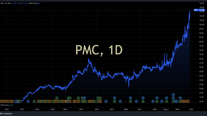 Đóng cửa phiên 3/12, cổ phiếu PMC tăng mạnh hơn 7% chạm ngưỡng 117.000 đồng/cp, đánh dấu kỷ lục mới về thị giá. Tính từ đầu năm, thị giá PMC chứng kiến mức tăng tới hơn 50% giá trị, vốn hóa đạt gần 1.100 tỷ đồng.