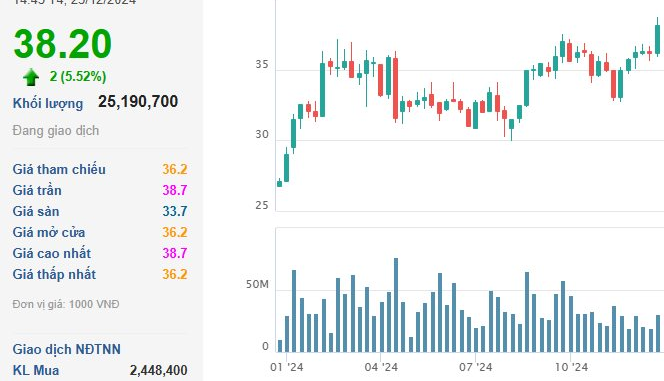 Cụ thể, kết phiên 25/12, giá cổ phiếu CTG của ngân hàng TMCP Công thương Việt Nam (Vietinbank) ở mức 38.200 đồng/cổ phiếu, tăng 5,25% so với phiên trước, khối lượng cổ phiếu giao dịch khớp lệnh tăng đột biến đạt gần 25,2 triệu đơn vị – tăng hơn 8 lần phiên trước.