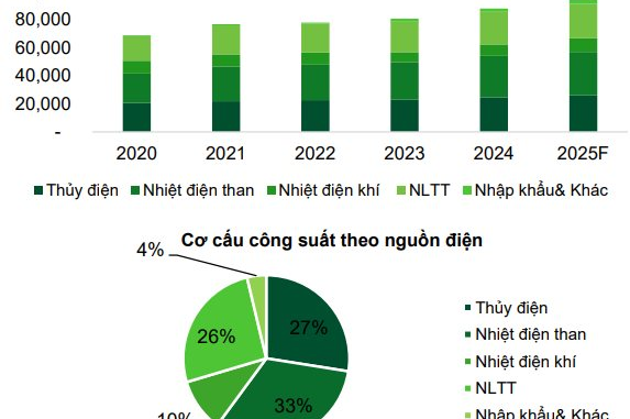 Về công suất 2025, VCBS dự phóng công suất hệ thống điện đạt 94,2 GW (+7,8% so với hiện tại). Các nguồn mới đóng góp chủ yếu đến từ các nhiệt điện (2.954 MW), thủy điện (1.473 MW), NLTT (1.177 MW), nhập khẩu (1.160 MW).